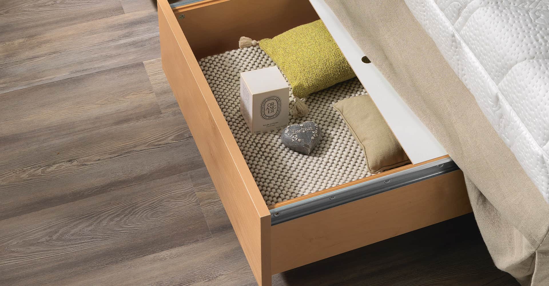Dorsal's space-saving drawers are positioned in the area below the anatomical support and slide smoothly on runners attached to the frame. They are equipped with a practical dust-proof closure and their beech finish matches the frame aesthetically.