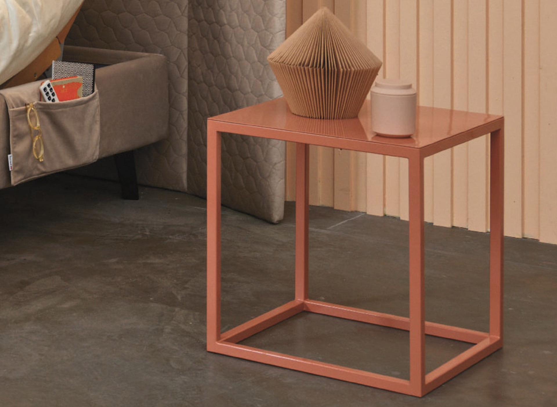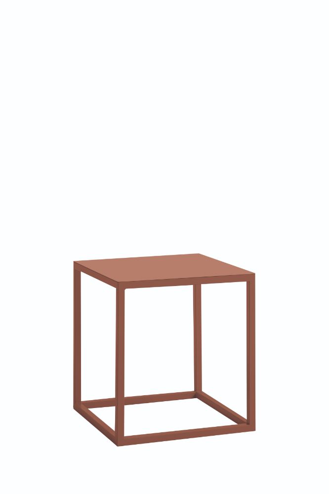 Side table with supporting structure and shelf in lacquered metal, available in colors: Sablè, Flower, Antracite, and Rame.