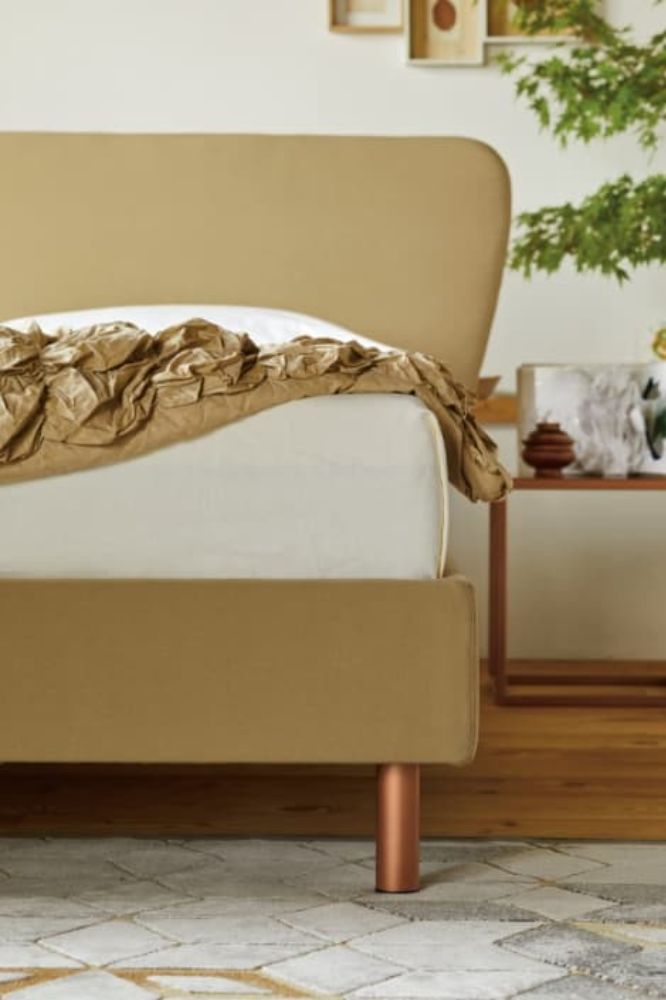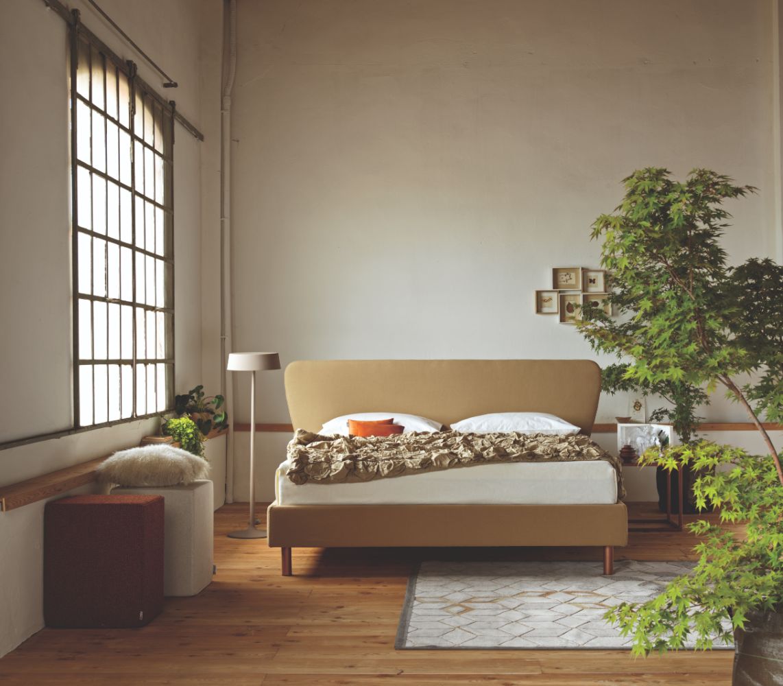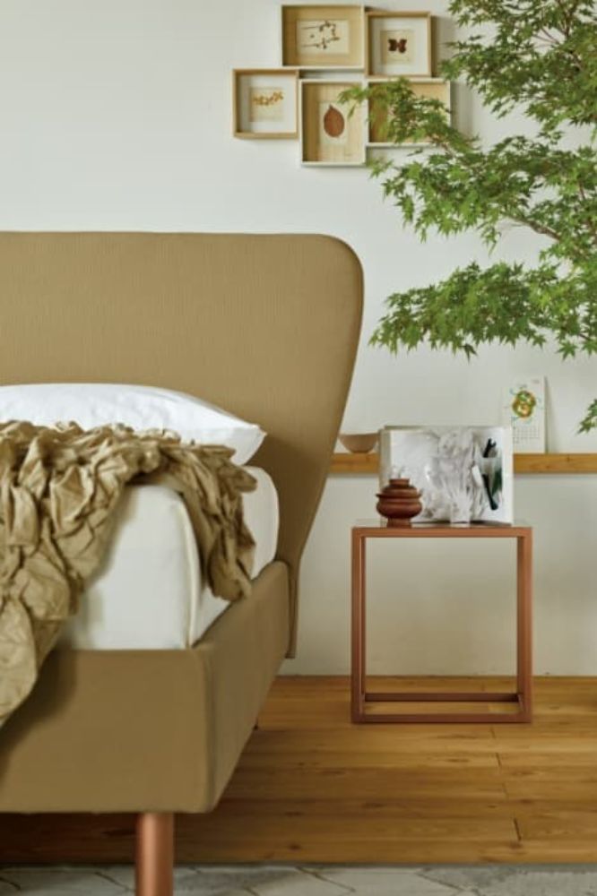 The padded profile of the headboard closes with a harmonious and natural graphic mark. The More M04 bed is completely removable. Copper finish D50 feet. The feet add an extra touch of style to the decor. In More beds, you can choose the most pleasing combination from the range of available feet.