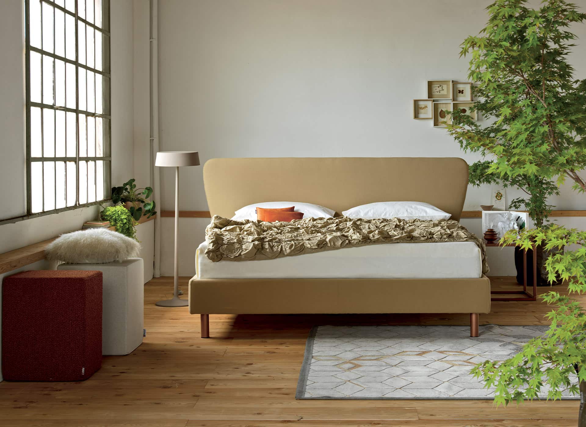 Headboard and bed frame in Cotone Iride 370 Biscotto. Reading cushions in Cotone Iride 350 Corallo and Velluto 131 Ruggine. Copper finish table. Square pouf Cotone Loto 155 Sabbia. Orsetto Bouclé pouf 304 Ruggine.