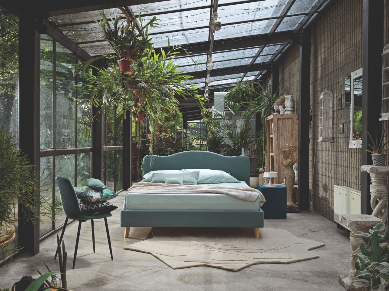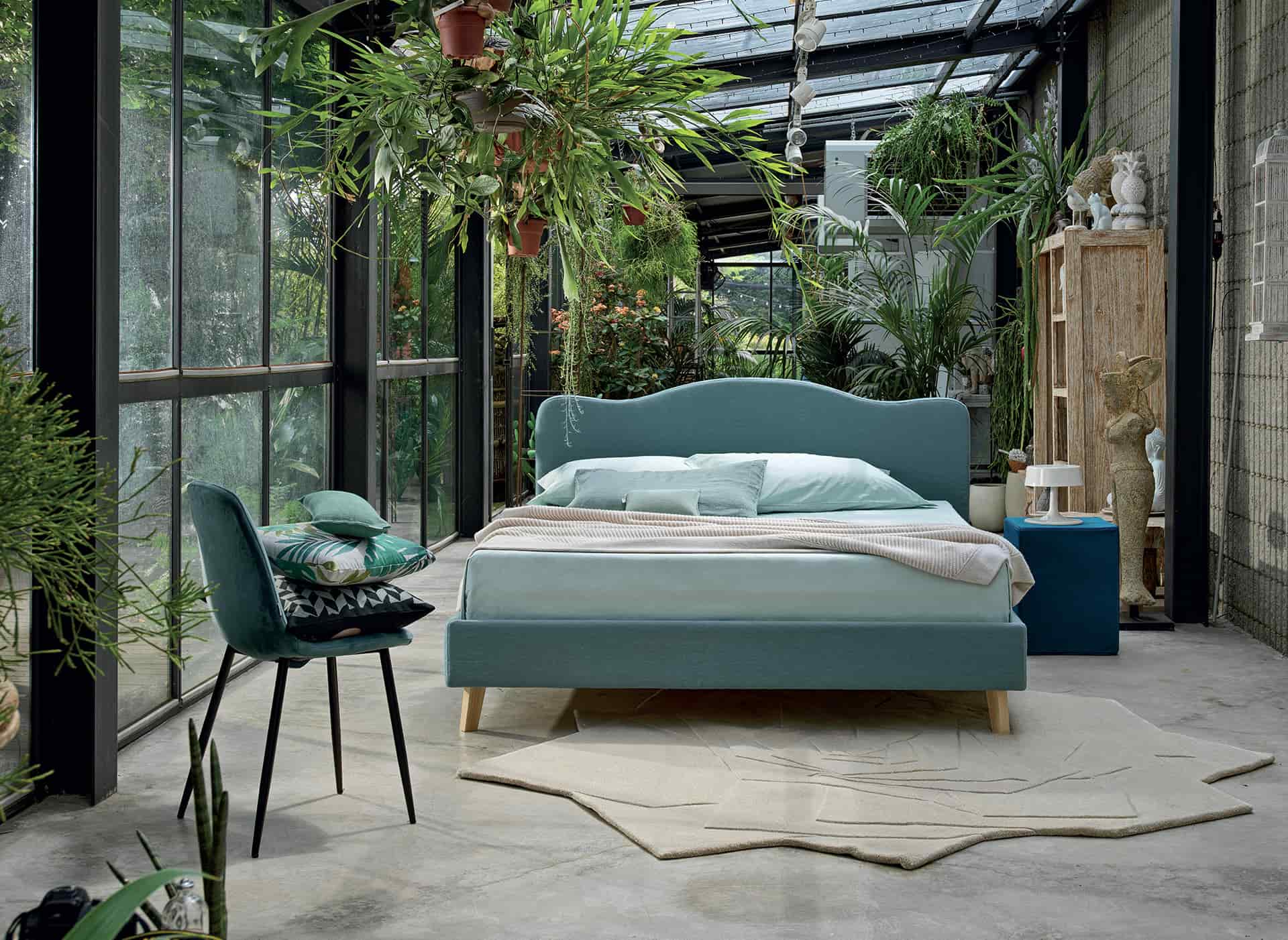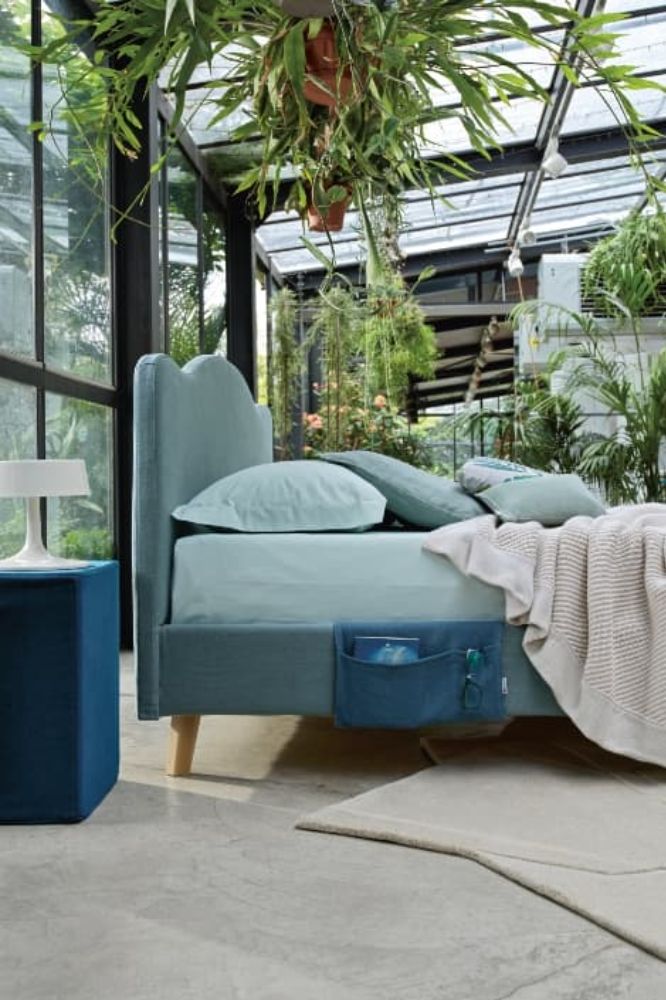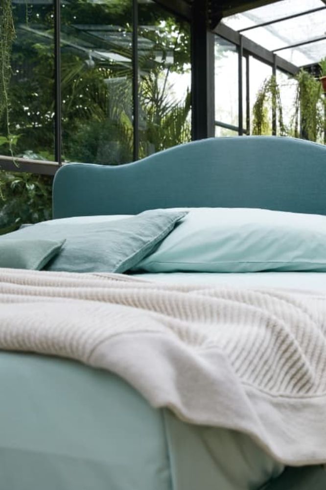 Headboard and bed frame in Lino 100% 540 Avio. Reading cushion in Cotone Loto 165 Verde Acqua. Square pouf Velluto 137 Notte. Beech wood feet P90.
