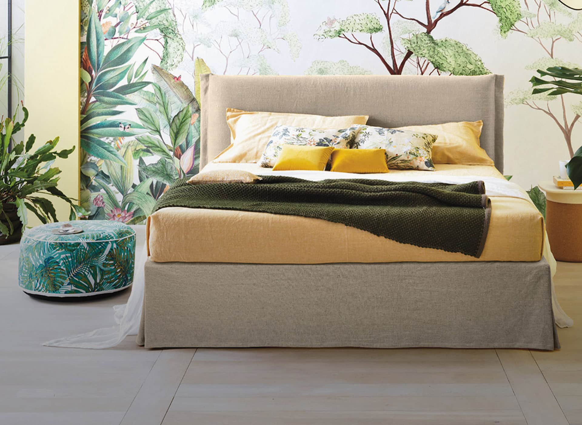 Headboard and skirt in Natural 462 Sacco. Reading cushions Velluto 130 Zafferano.