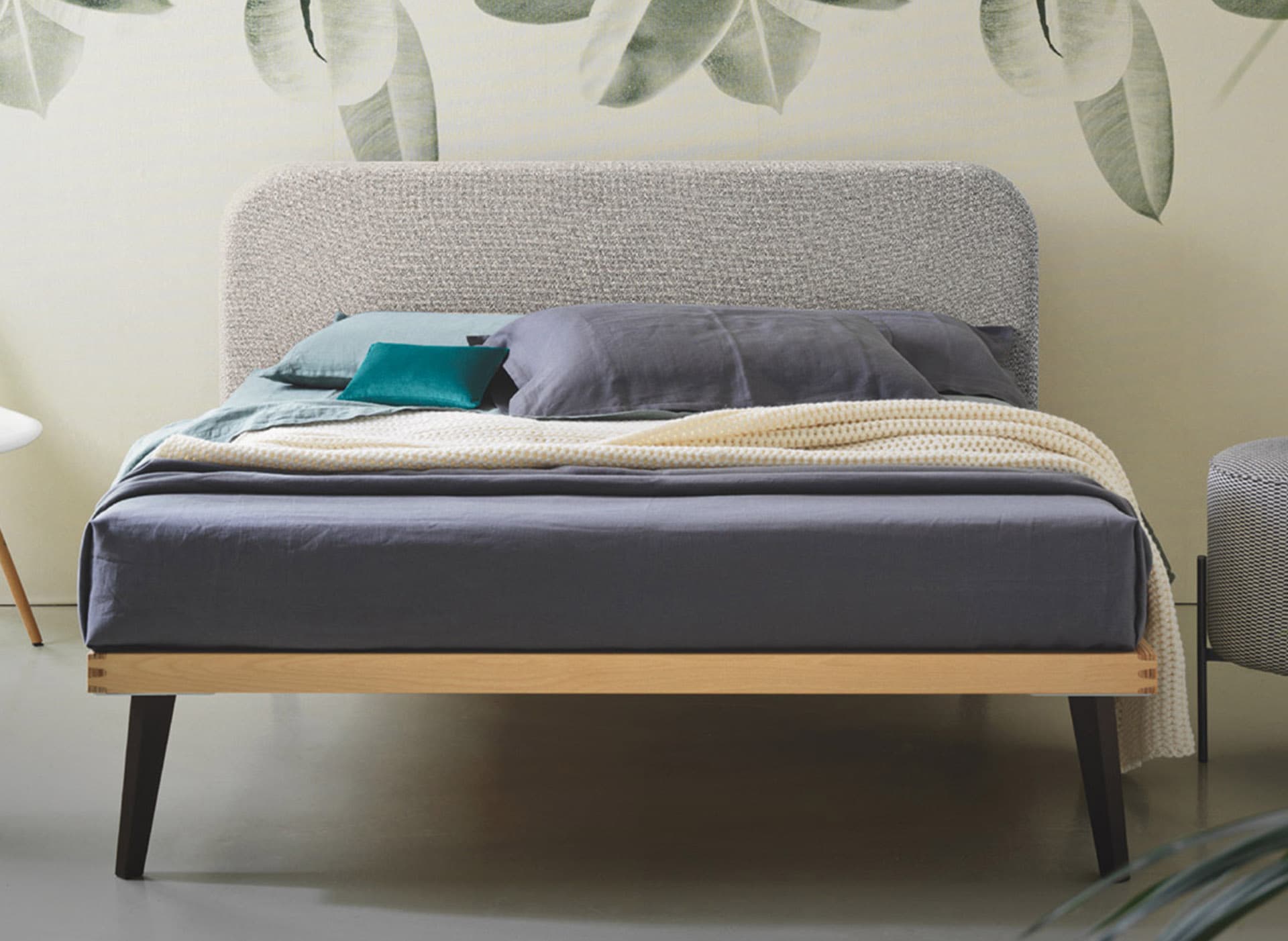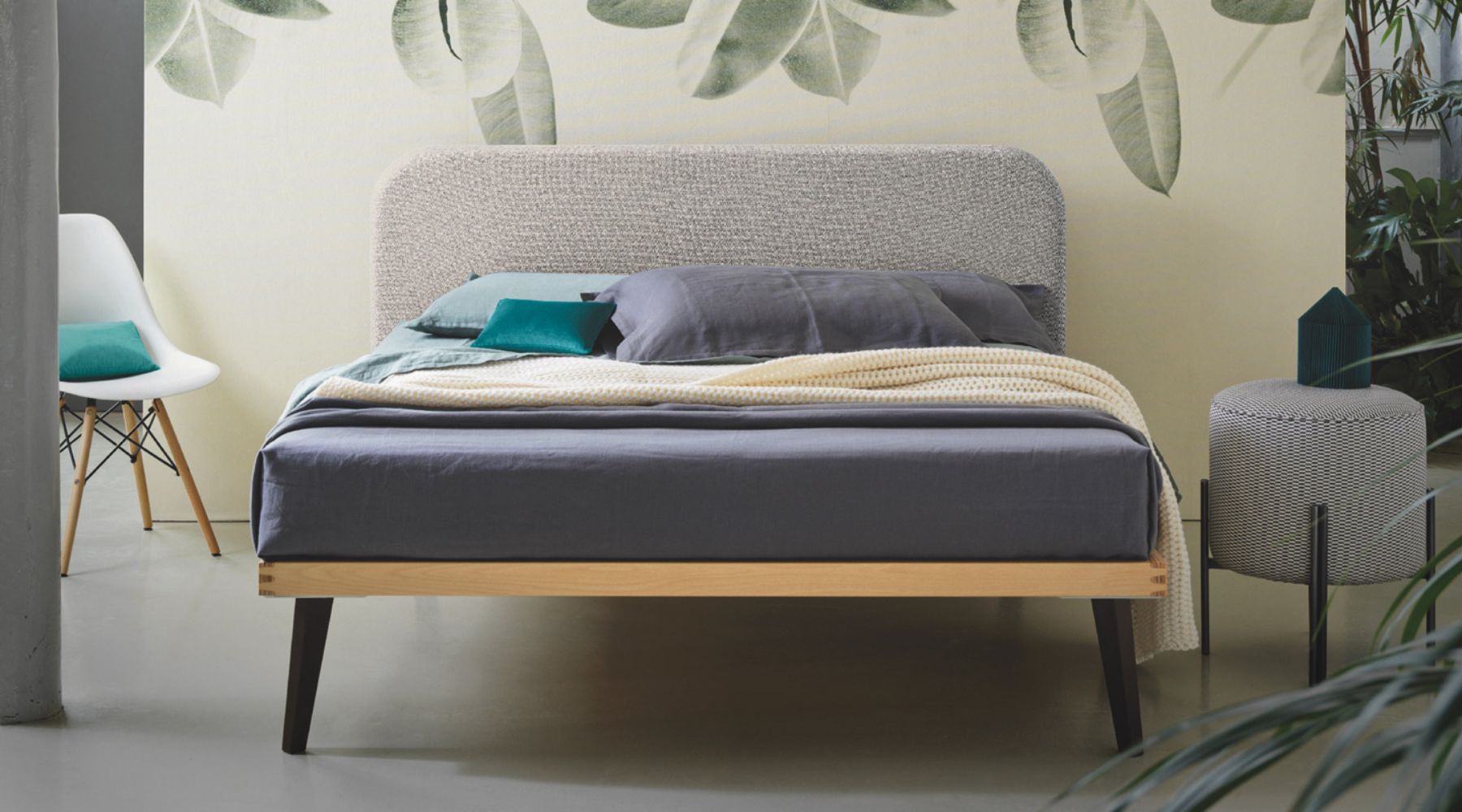 Cotton Headboard C80 Loto 159 fumo. Ergonomic Slatted Bed Base in beech wood Ergo FA. Reading cushion in velluto 135 petrolio and 134 turchese. Black feet P90.