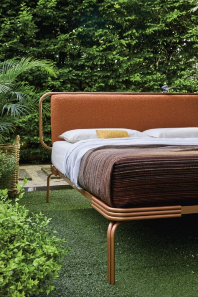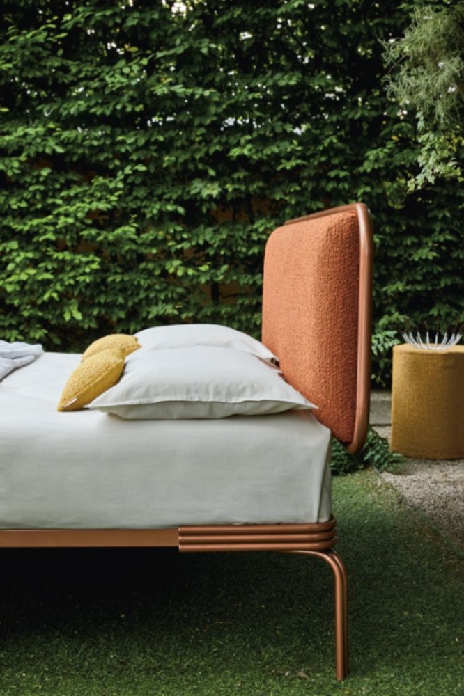 Super Anniversary with corner mouldings and P 20 copper feet. Headboard Orsetto bouclè 304 rust. Orsetto bouclè 306 ochre reading cushion and pouf. Copper finish coffee table.