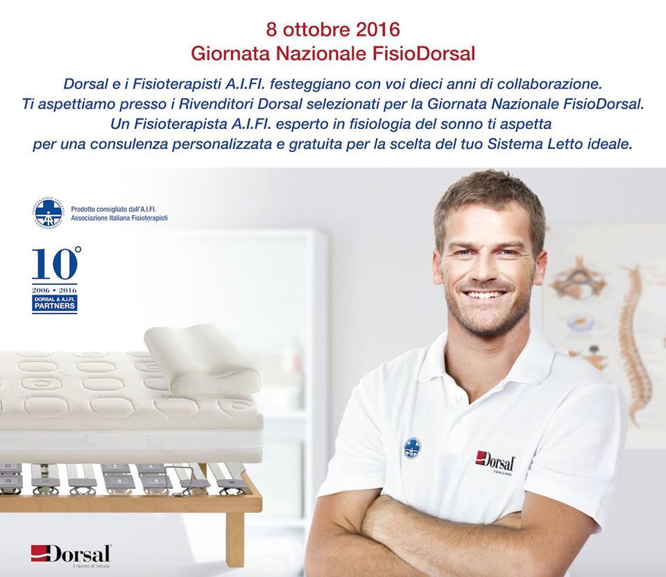 Dorsal e i fisioterapisti A.I.Fi. festeggiano dieci anni di collaborazione. Dieci anni nei quali il riposo e la salute sono sempre stati al centro della comune attività. Dieci anni di dialogo rivolto ad approfondire il legame fra corpo umano e sistema letto, un dialogo che ancora una volta si rinnova per continuare assieme un lavoro di divulgazione.