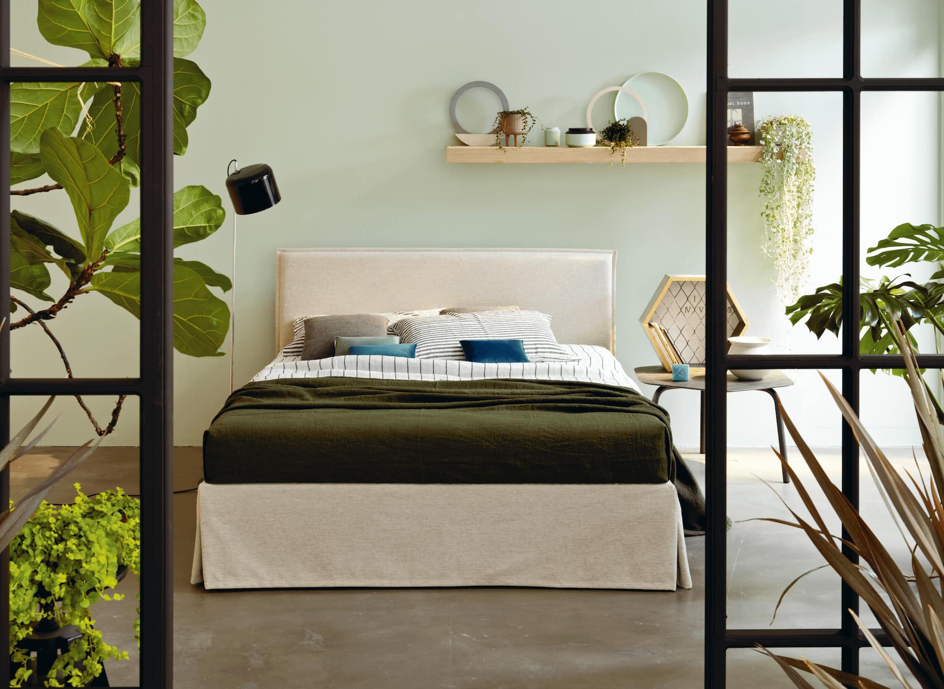 Testiera e gonnellina clean 402 sabbia. Cuscini lettura velluto 136 Avio e 137 Notte.