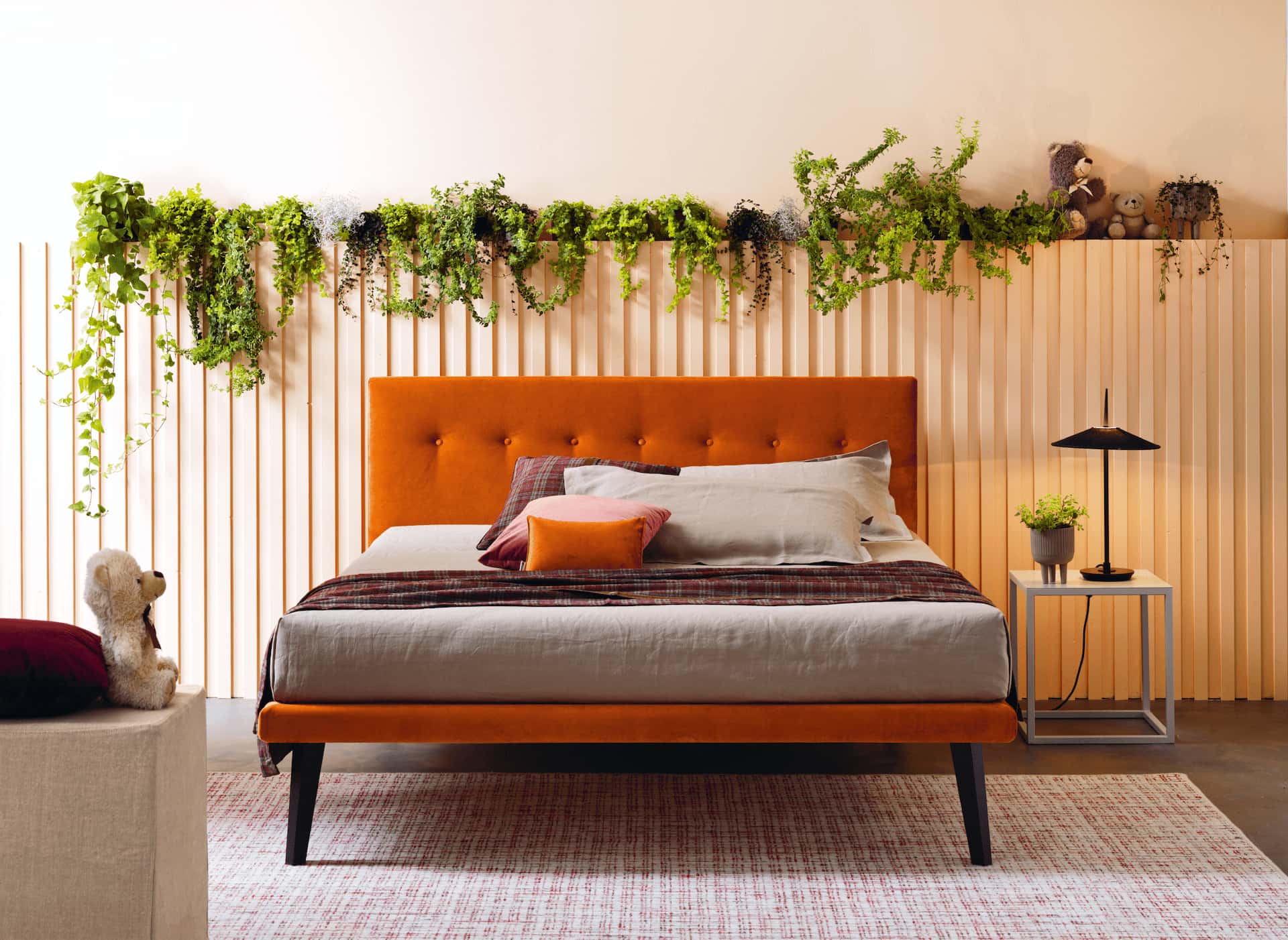 Impreziosita da impunture a bottoni, la versione C55 si trasforma, acquisisce un carattere più sofisticato e contemporaneo. Qui in abbinamento con il supporto a doghe Forest rivestito con bumper.