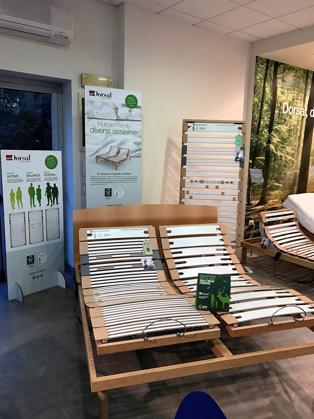 Come detto, credo che questa sia la direzione giusta da intraprendere oggi: maggiore attenzione all’ambiente e alla salute dell’uomo. Credo molto nel progetto di Dorsal e vedo che sempre più la clientela è interessata a questo tipo di filosofia. Oggi dobbiamo salvaguardare il nostro pianeta anche con le nostre scelte, perché pure con i nostri acquisti possiamo fare la differenza. Quindi credo che queste certificazioni ambientali sul legno delle reti a doghe siano fondamentali. Tutti noi siamo interessati non solo a preservare l’ecosistema per i nostri figli, ma a saperne di più sui prodotti che acquistiamo. Dorsal, attraverso le sue numerose certificazioni, ci dà maggiori certezze e grande trasparenza su tutti i suoi prodotti e io mi faccio volentieri portavoce di questa sua filosofia green.Quali prodotti Dorsal avete in negozio?